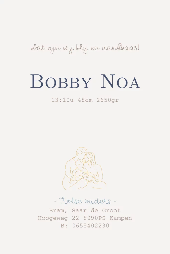 Een prachtig geboortekaartje in blauw en goud. Personaliseer eenvoudig in onze online editor voor jouw speciale moment.