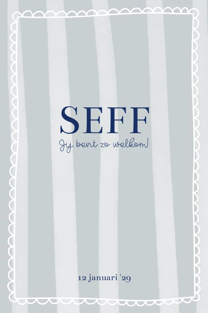 Een lief geboortekaartje voor een jongen met gestreepte achtergrond in wit licht blauw met golfjes rand en blauwe letters kun je zelf helemaal aanpassen naar wens.