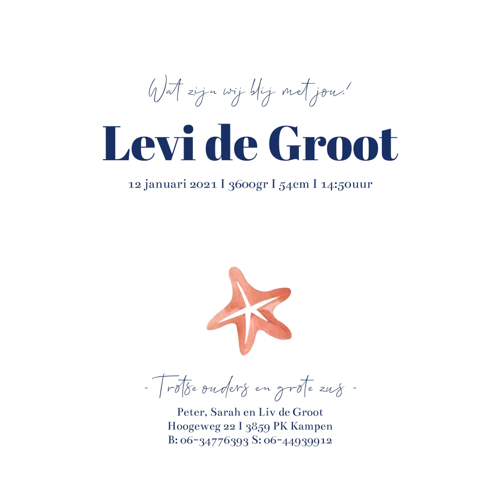 Geboortekaartje jongen met blauwe zeilboot zeester en anker erop