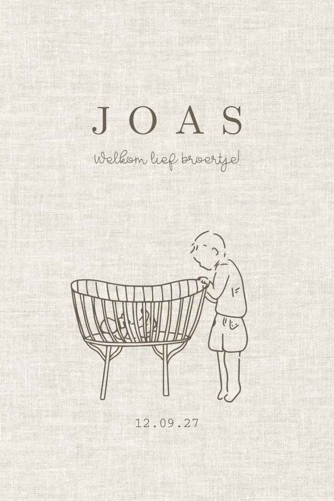 Een lief geboortekaartje voor een jongen of meisje met een lijntekening van een broertje die over de rand van de wieg heen kijkt.