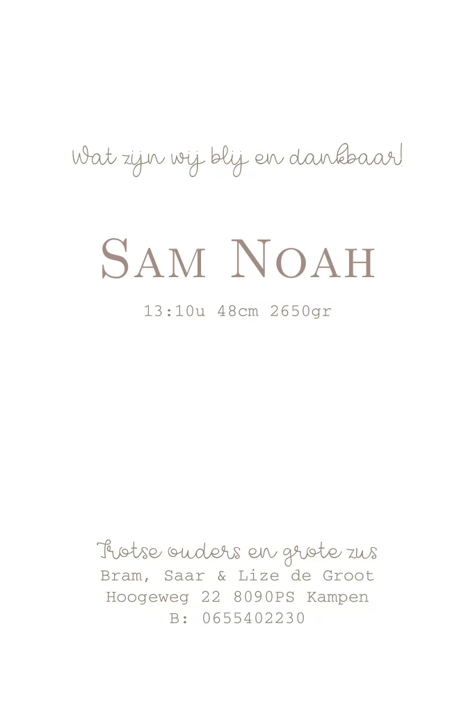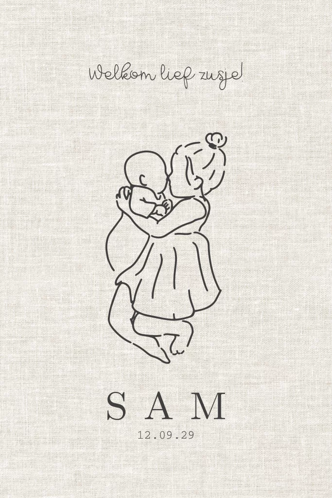 Een lief geboortekaartje voor een jongen of meisje met een lijntekening van een grote zus met haar broertje of zusje. Deze lijntekening kan aangepast worden naar jullie gezinssamenstelling :)