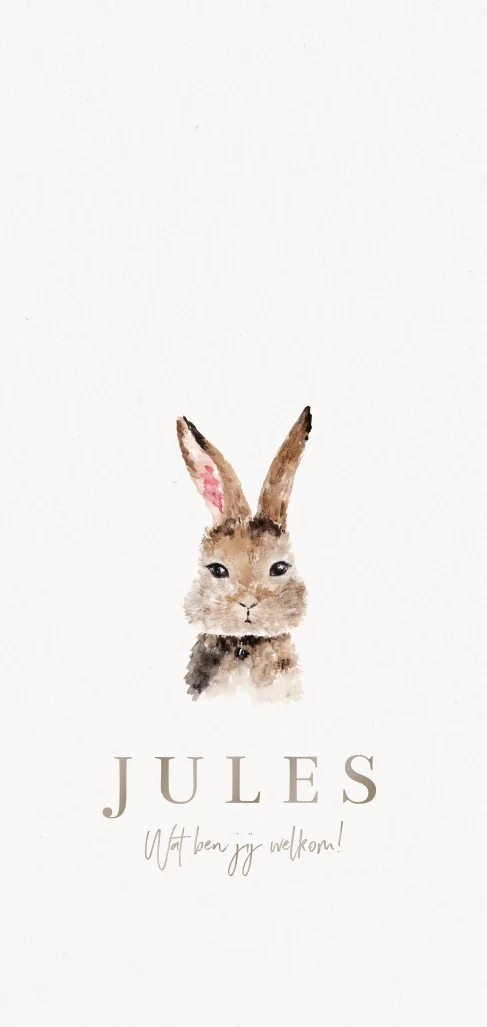 Een lief geboortekaartje voor een jongen of meisje met een lief geschilderd konijntje. Je kunt dit kaartje aanpassen naar wens.
