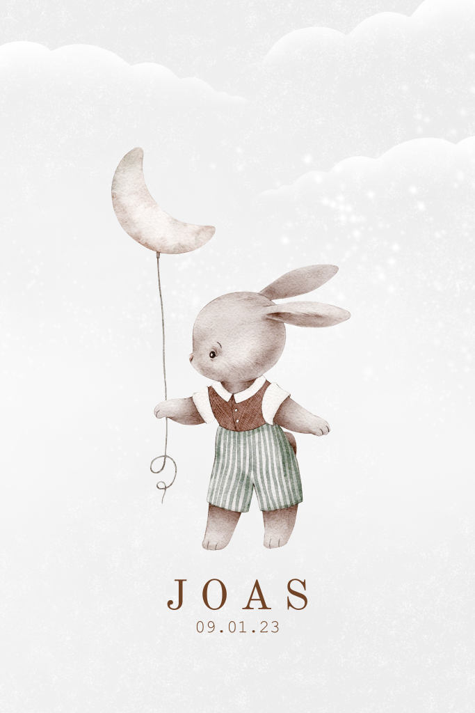 Een lief geboortekaartje voor een jongen of meisje met een geschilderd watercolour konijntje met ballon in maanvorm. Joas