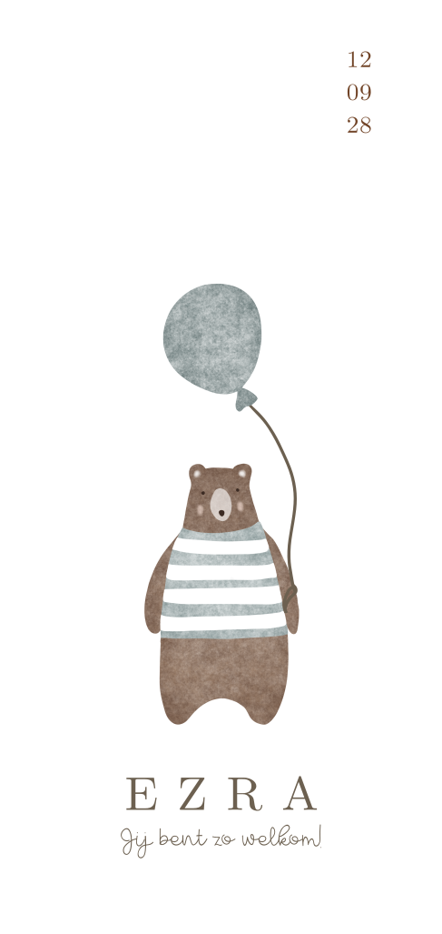 Dit lieve geboortekaartje voor een jongen met illustratie van een bruine beert met blauw gestreept truitje kun je zelf aanpassen naar wens.