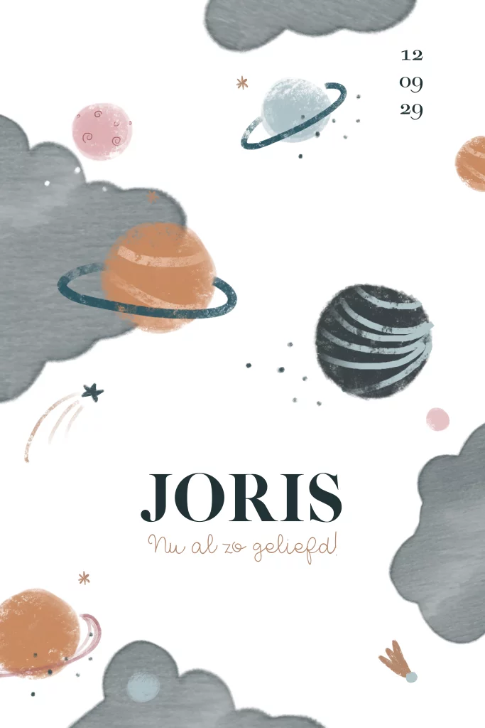 Geboortekaartje jongen met planeten sterren ruimte oranje blauw roze