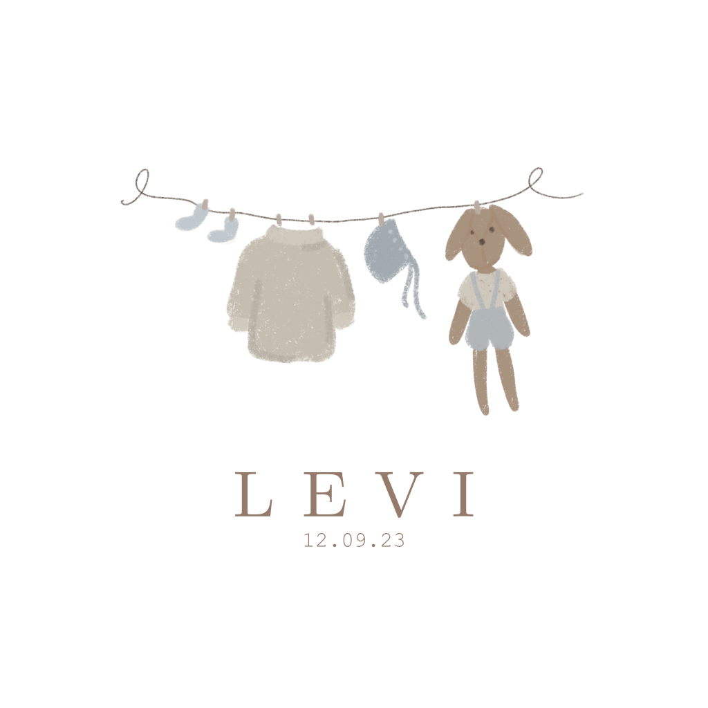 Een lief klassiek geboortekaartje voor een jongetje. Met waslijn met baby kleding en een knuffel eraan.