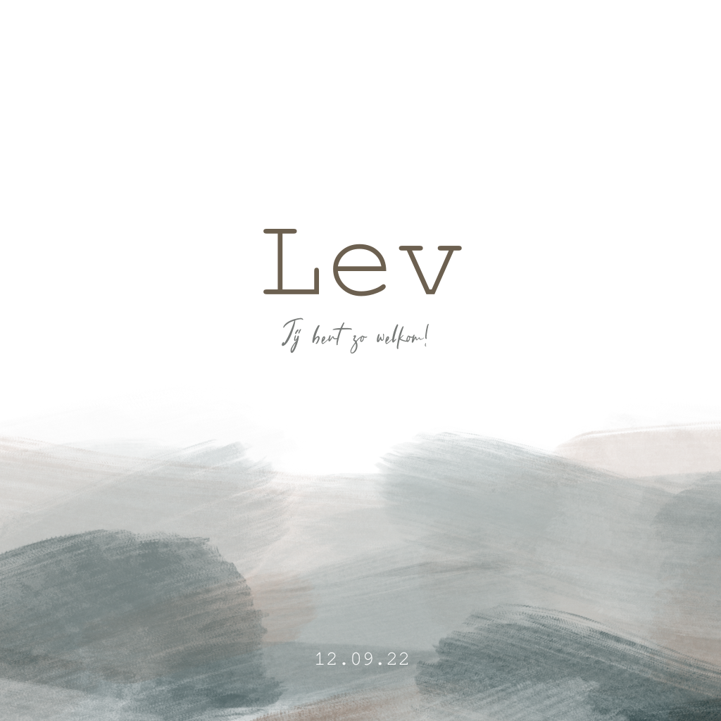 Dit geboortekaartje voor een jongen met donkerblauwe en bruine strepen kun je aanpassen naar wens. De naam Lev en alle andere teksten pas je ook aan voor jullie jongetje.
