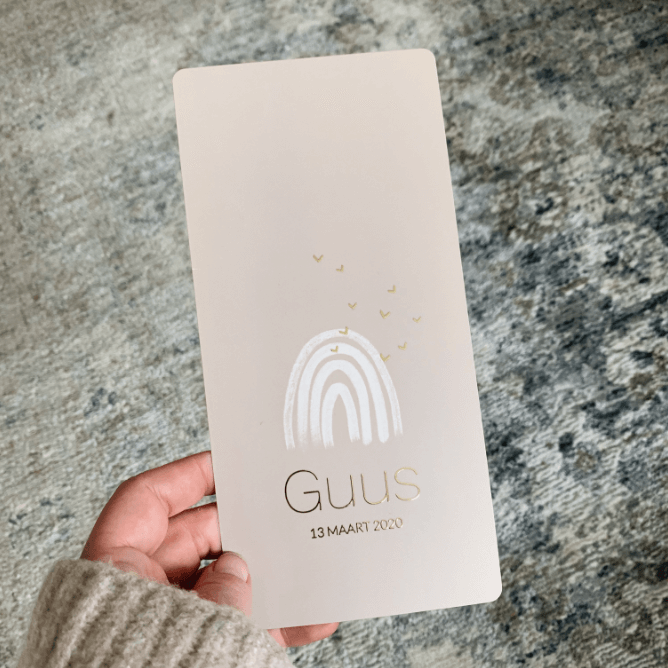 Dit langwerpige geboortekaartje met beige achtergrond en witte regenboog kan voor zowel een meisje als een jongen. Ook folie kleur kun je aanpassen.