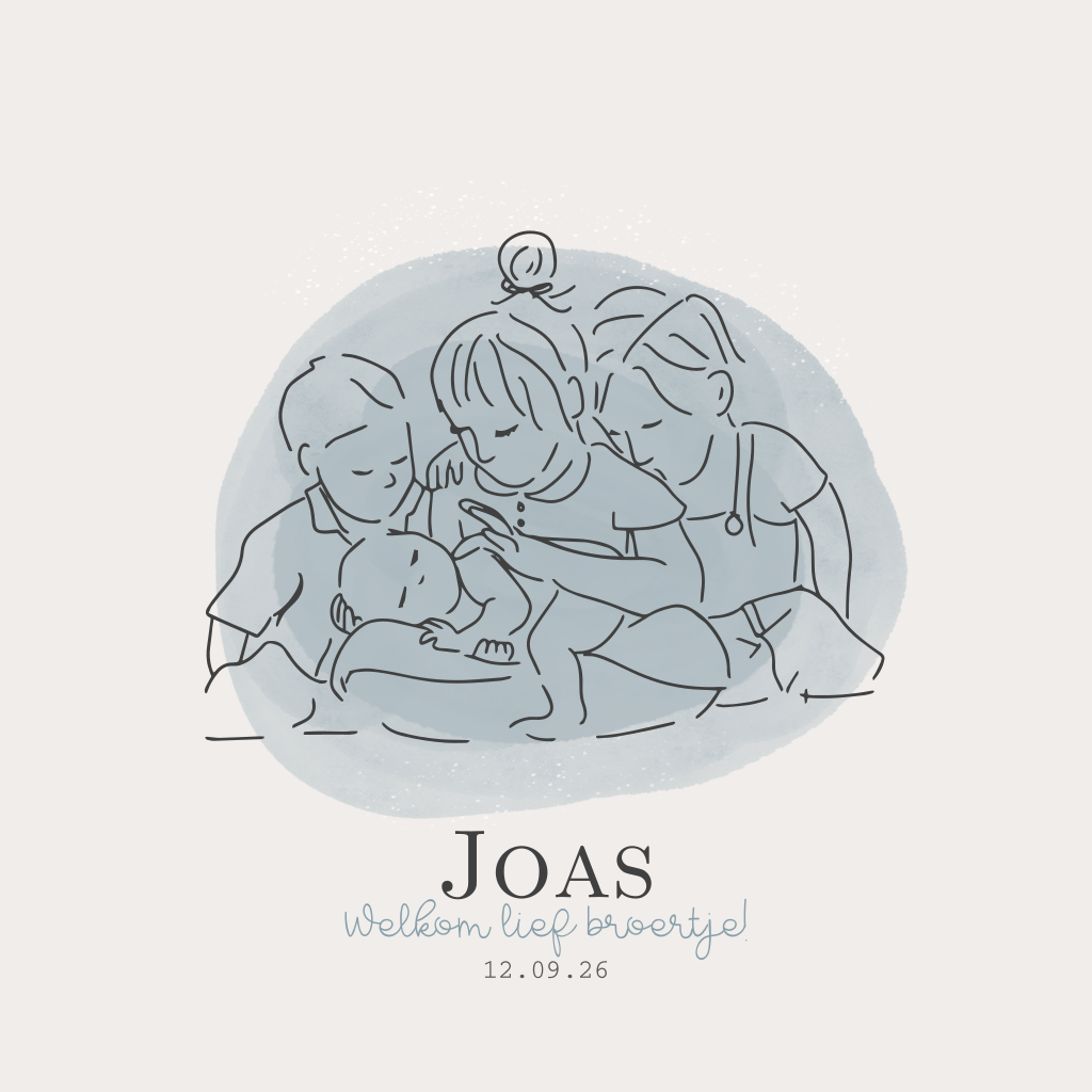 Geboortekaartje lijntekening broers en zus met baby broertje blauw