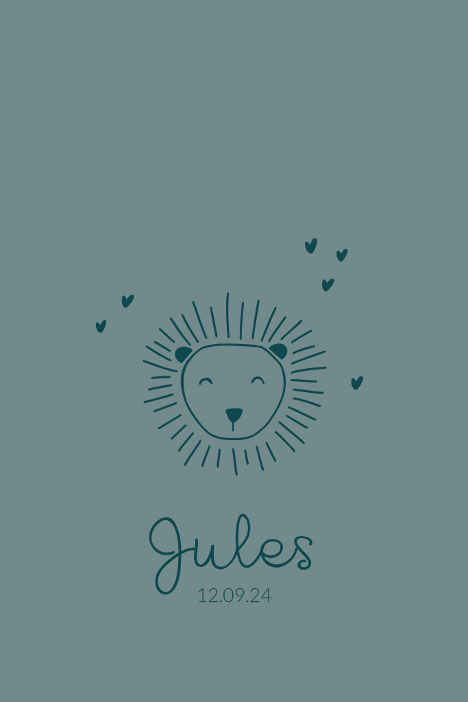 Dit geboortekaartje met een hoofd van een leeuwen welpje als lijntekening in blauw groene kleur kun je aanpassen naar wens voor jullie zoontje. Jules
