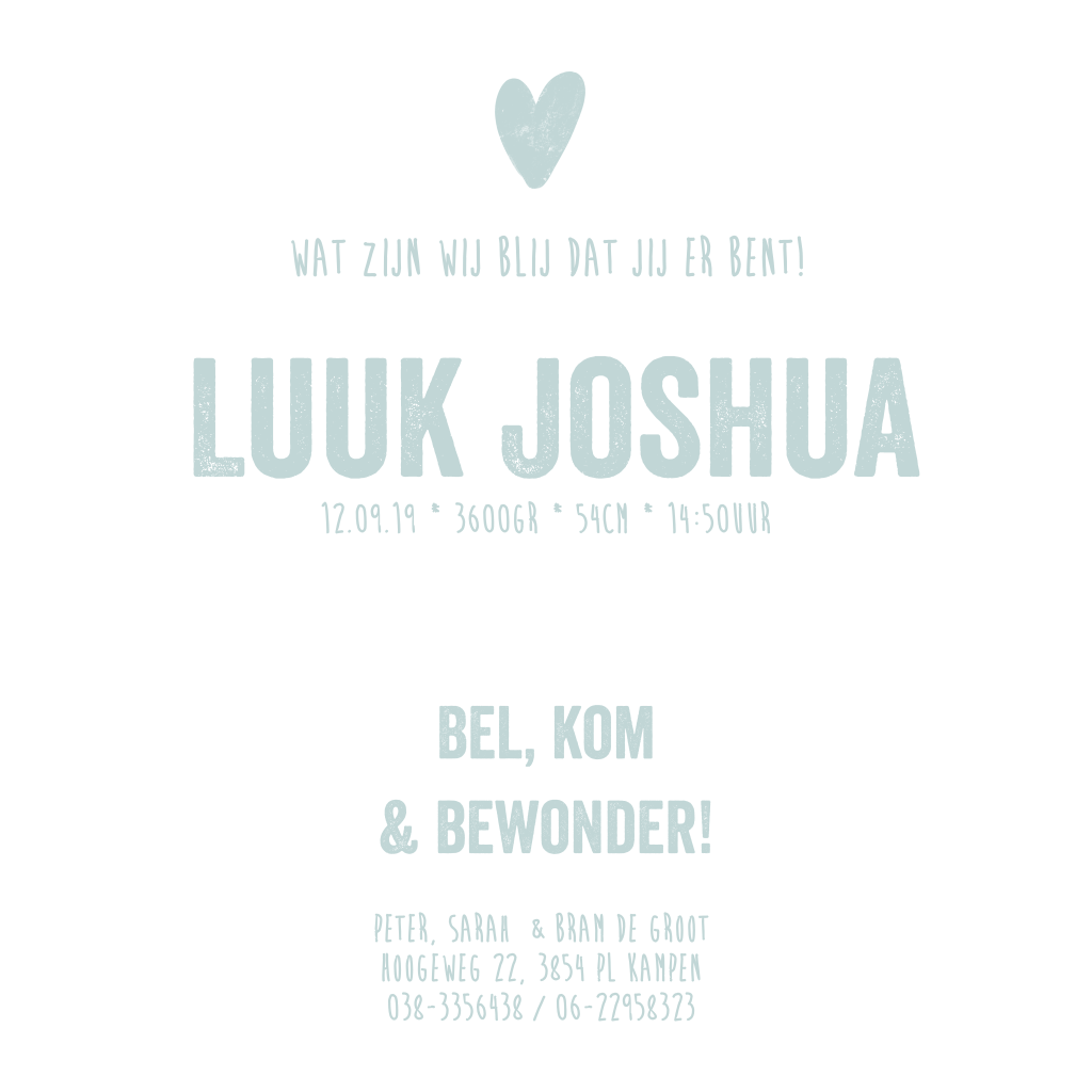Pas dit geboortekaartje helemaal aan naar wens. Zowel het lettertype als de kleuren zijn aan te passen. De attributen zijn te vergroten, verkleinen en verplaatsen.