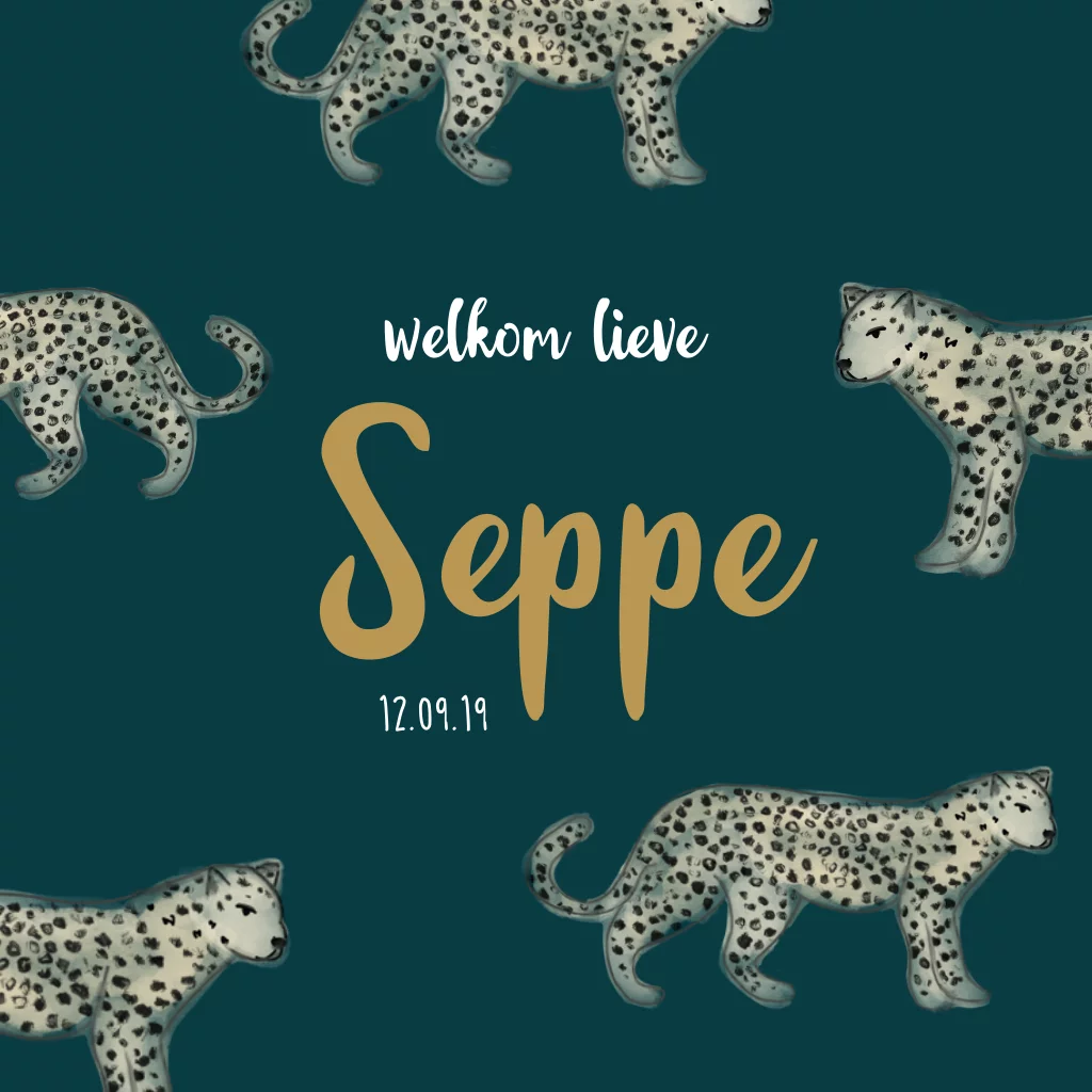 Dit geboortekaartje voor een jongen is hip en trendy door de luipaarden. Alle kleuren en attributen kun je aanpassen. Seppe