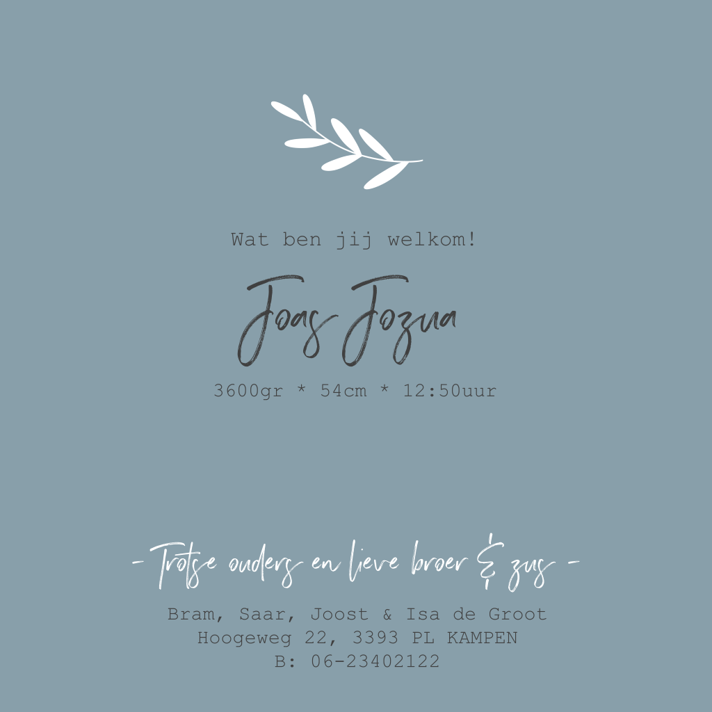 Dit lieve geboortekaartje voor een jongen met een klein boeketje bloemen kun je helemaal aanpassen zoals je wilt. Joas