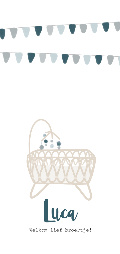 Dit lieve geboortekaartje voor een jongen met retro rotan wiegje en vlaggetjes pas je aan naar wens en smaak. Een babykamer op een kaartje. Luca