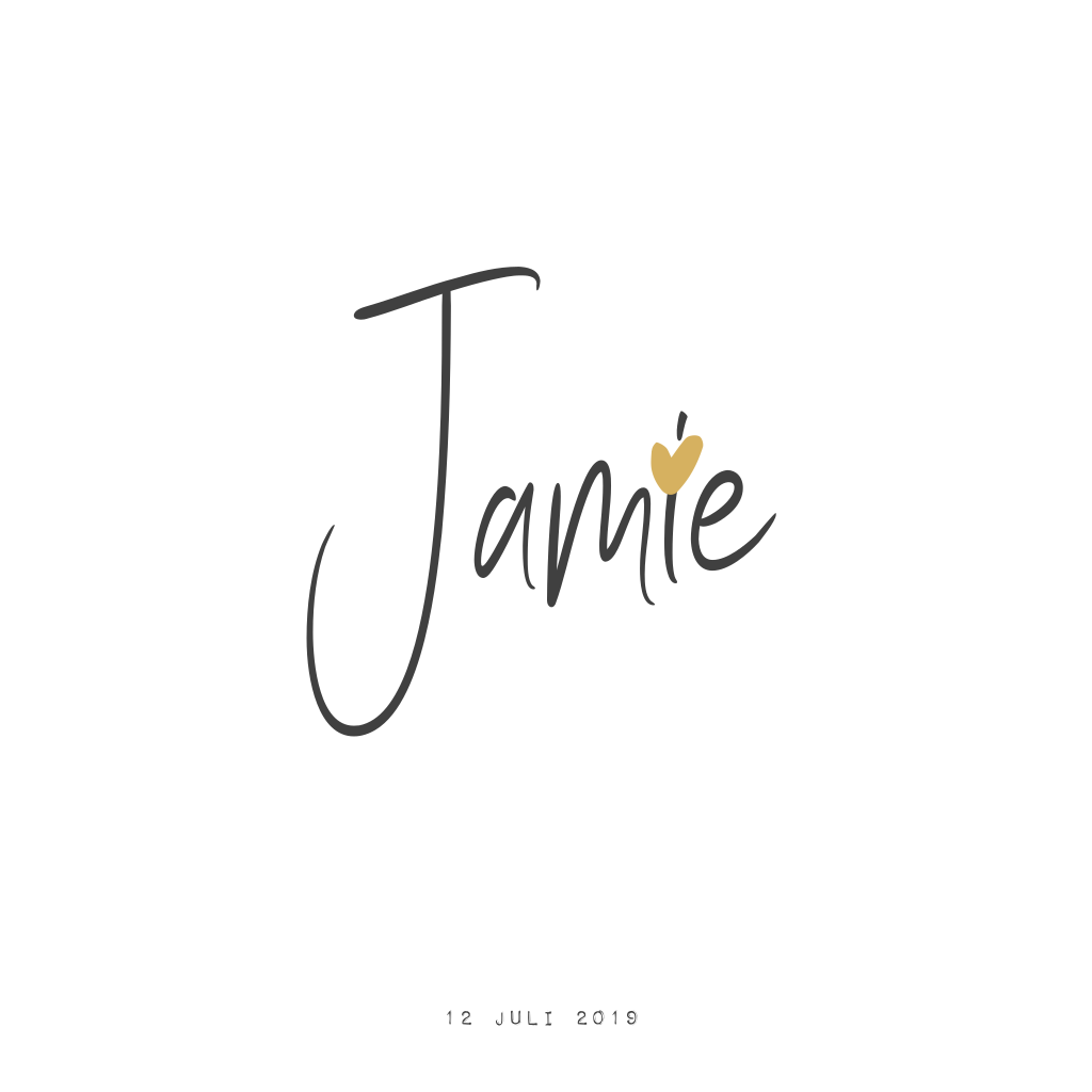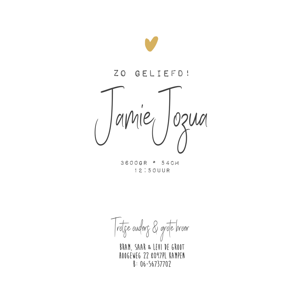 Dit minimalistiche geboortekaartje voor een jongen met okergeel hartje pas je zelf aan naar wens en smaak. Jamie