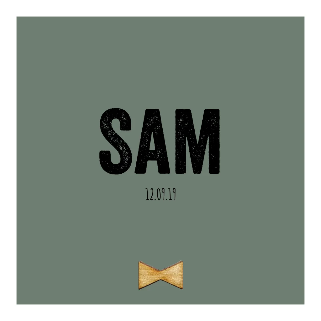 Dit stoere geboortekaartje voor een jongen met donker groene achtergrond kun je helemaal aanpassen naar smaak. Het plaatje van het houten strikje kun je weghalen en een echt houten strikje hiervoor bestellen. Op het strikje zit een stickertje waarmee je het heel gemakkelijk opplakt.