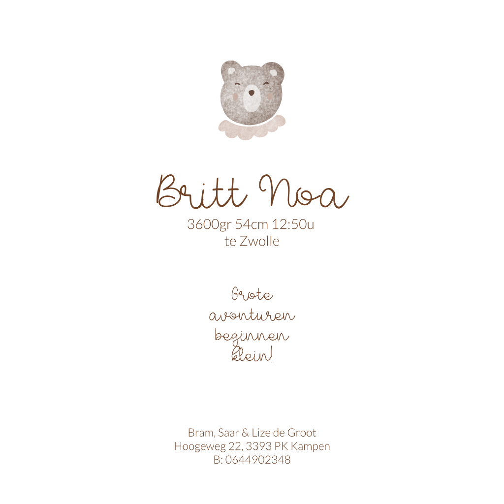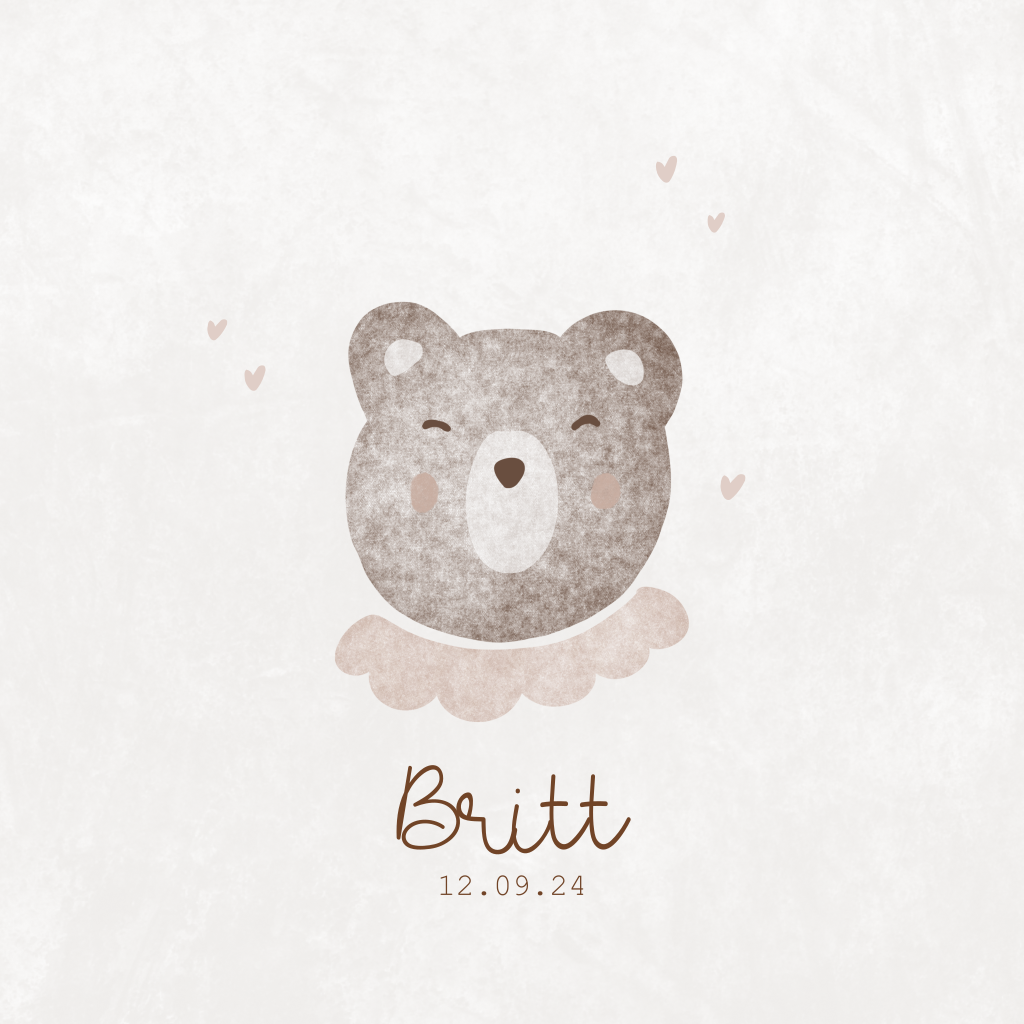 Dit lieve geboortekaartje voor een meisje met illustratie van de hoofd van een beer met roze kraagje kun je zelf helemaal aanpassen naar wens.