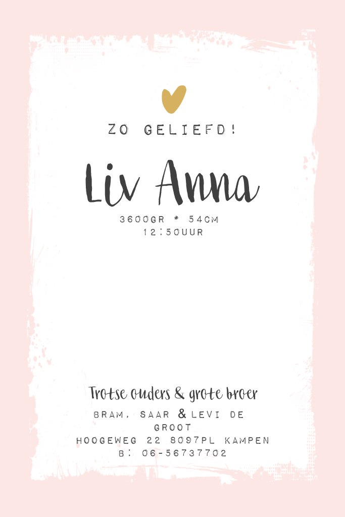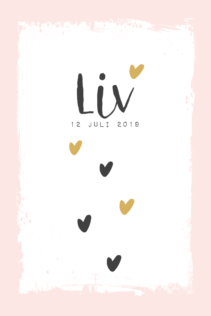 Dit lieve geboortekaartje pas je helemaal aan naar wens. De hartjes, de tekst en de hartjes kun je een andere kleur geven.