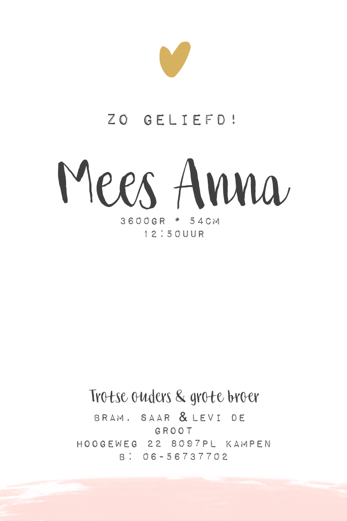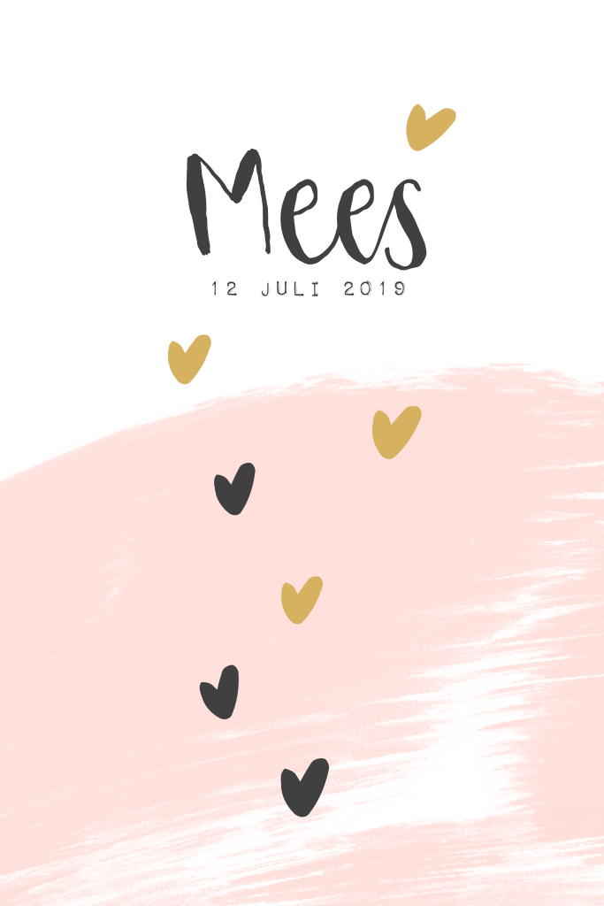 Dit lieve geboortekaartje pas je helemaal aan naar wens. De hartjes, de tekst en de hartjes kun je een andere kleur geven.