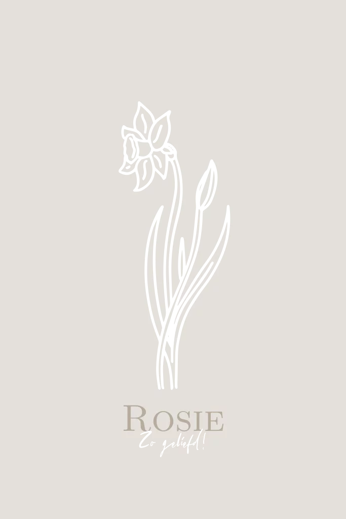 Geboortekaartje met de mooie geboortebloem de narcis voor de maand december. Je kunt het hele kaartje aanpassen naar wens voor jullie meisje. Rosie