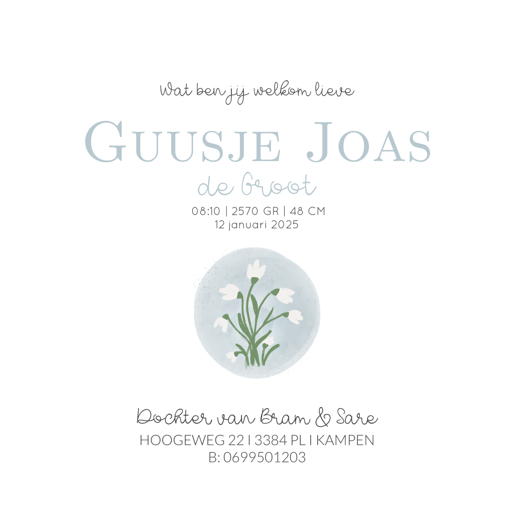 Dit geboortekaartje kan voor zowel een meisje als jongen met de geboortebloem sneeuwklokje van de maand januari. Liever enkelzijdig in plaats van dubbelzijdig of een andere vorm? Dat kan! Mail ons dan even.