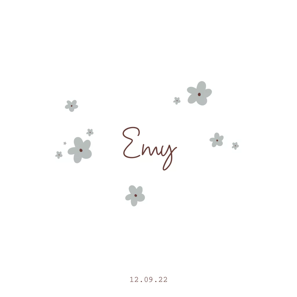 Een lief minimalistisch geboortekaartje voor een dochter met kleine blauwe bloemetjes. Met roestbruin rode tekst die je zelf aan kunt passen naar wens.
