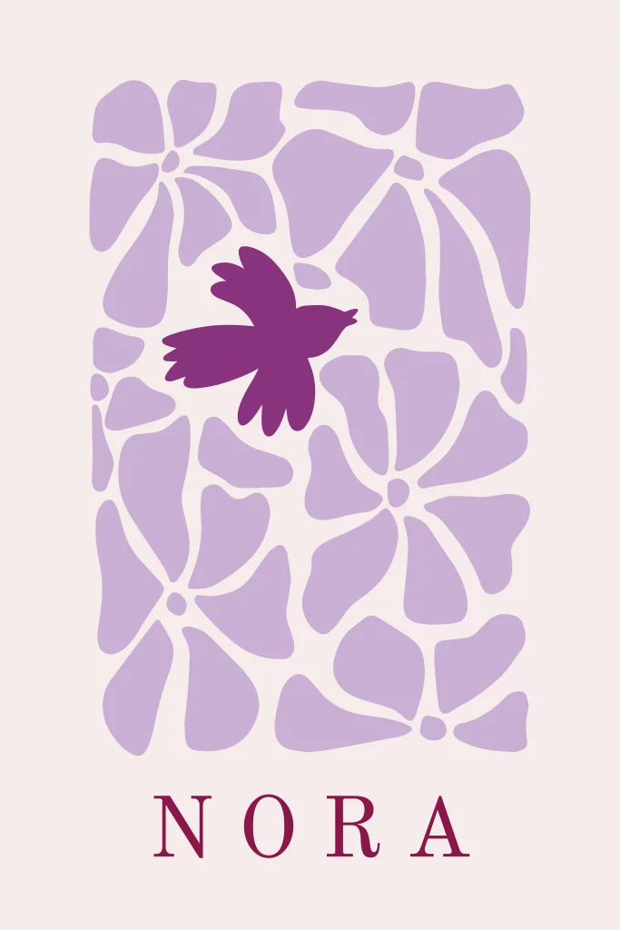 Dit geboortekaartje voor een meisje lijkt bijna op een schilderijtje door de bloemen voorop en het vogeltje. De lila en donker paarse kleuren van het kaartje kun je aanpassen naar wens.
