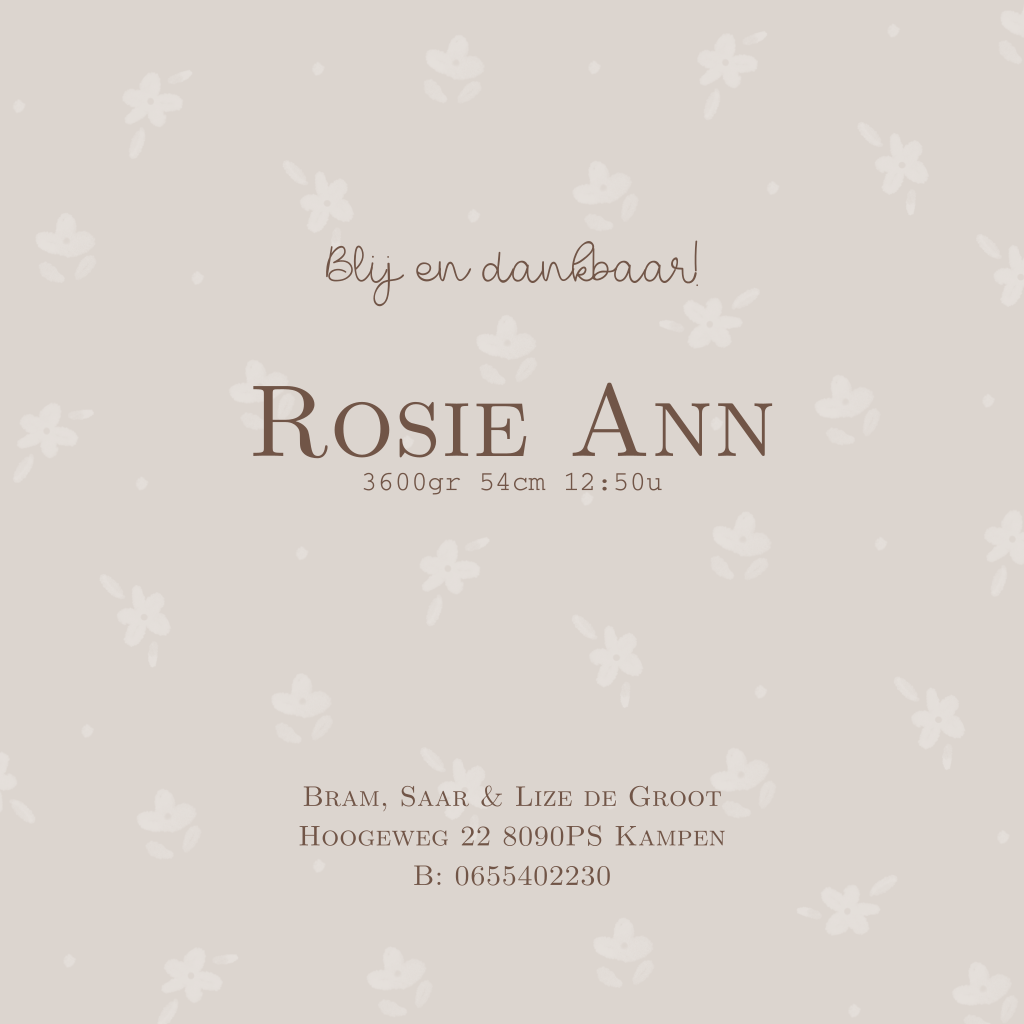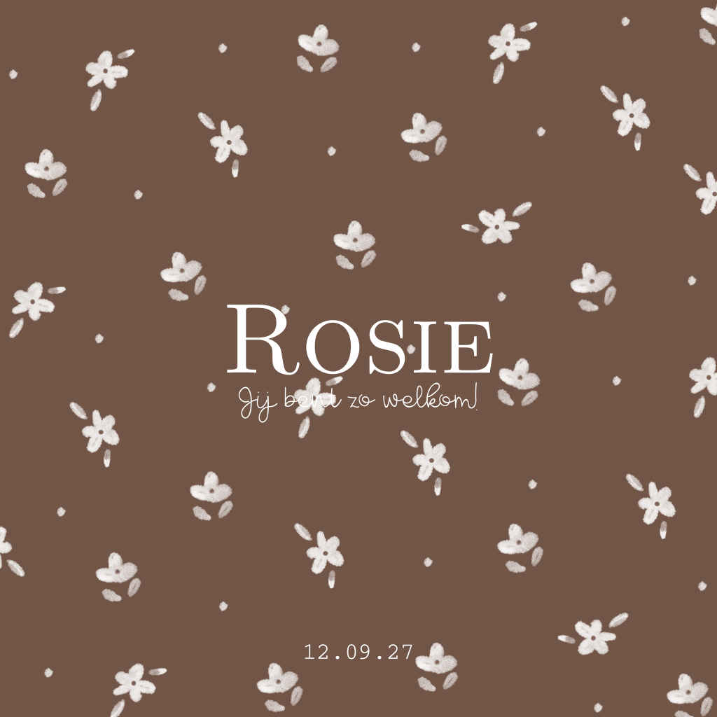 Dit lieve geboortekaartje voor een meisje met witte kleine bloemetjes print en bruine achtergrond kun je zelf aanpassen naar wens en smaak. Ook de foliekleur kun je aanpassen.