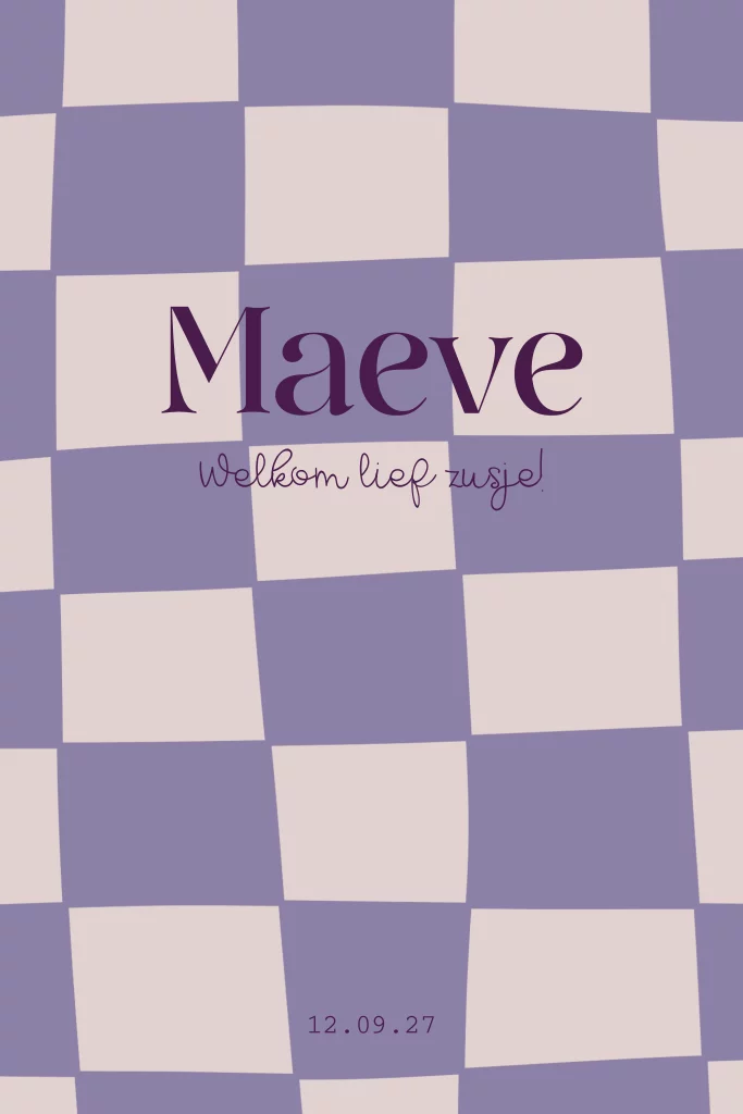 Dit geboortekaartje voor een meisje met een blokjes print in paarse en roze kun je zelf aanpassen naar smaak. Maeve
