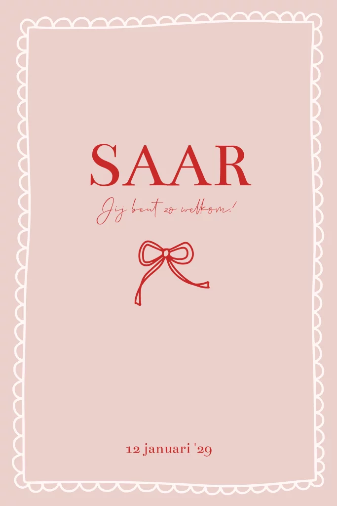 Dit vrolijke geboortekaartje voor een meisje met fel rood strikje en leuke witte golfjes rand kun je zelf helemaal aanpassen naar wens.
