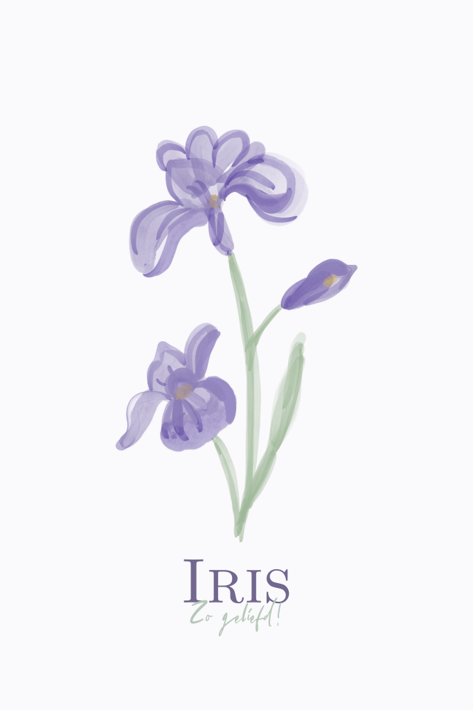 Geboortekaartje voor een meisje met de geboortebloem van februari de Iris in Lila paarse kleuren. Het kaartje kun je zelf aanpassen naar wens en smaak.