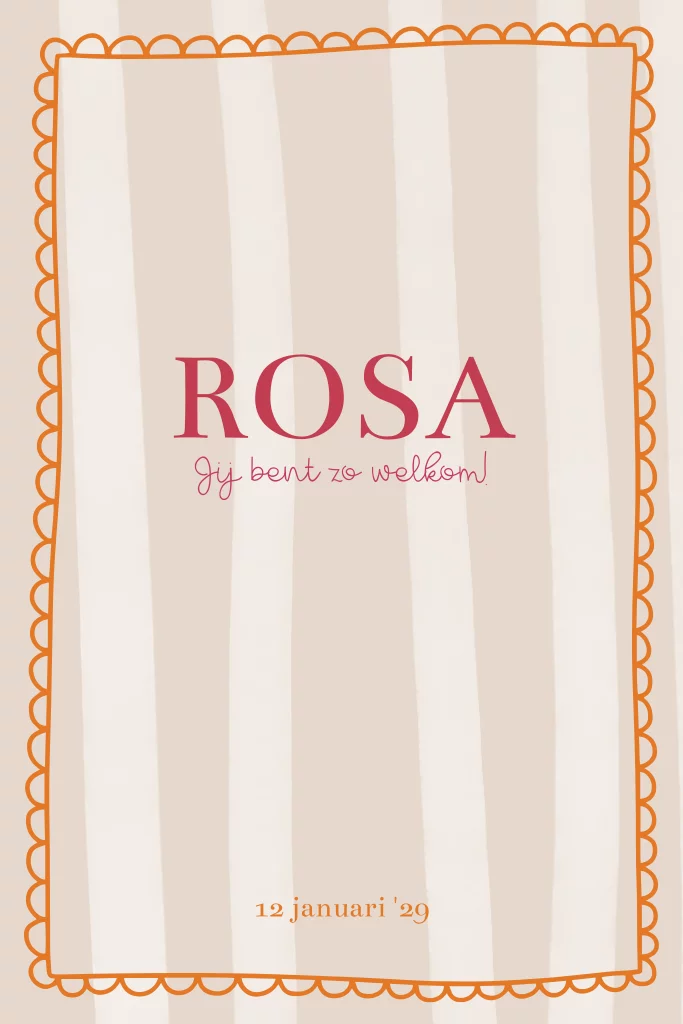 Een lief en vrolijke geboortekaartje voor een meisje met gestreepte achtergrond in wit en zalm kleur met oranje roze golfjes rand en knal roze letters kun je zelf helemaal aanpassen naar wens.