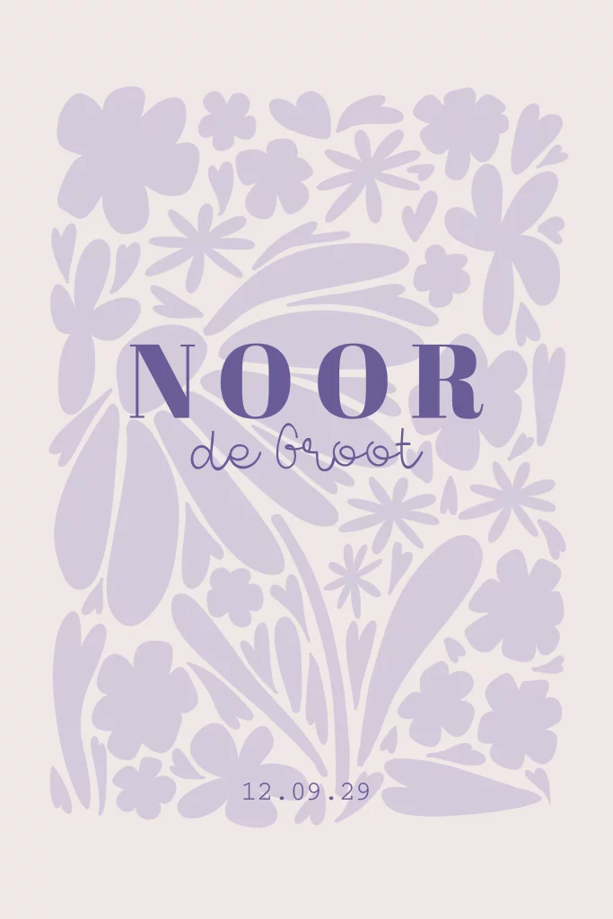 Dit geboortekaartje voor een meisje met lila paarse bloemen print kun je zelf helemaal aanpassen naar wens en smaak. Noor