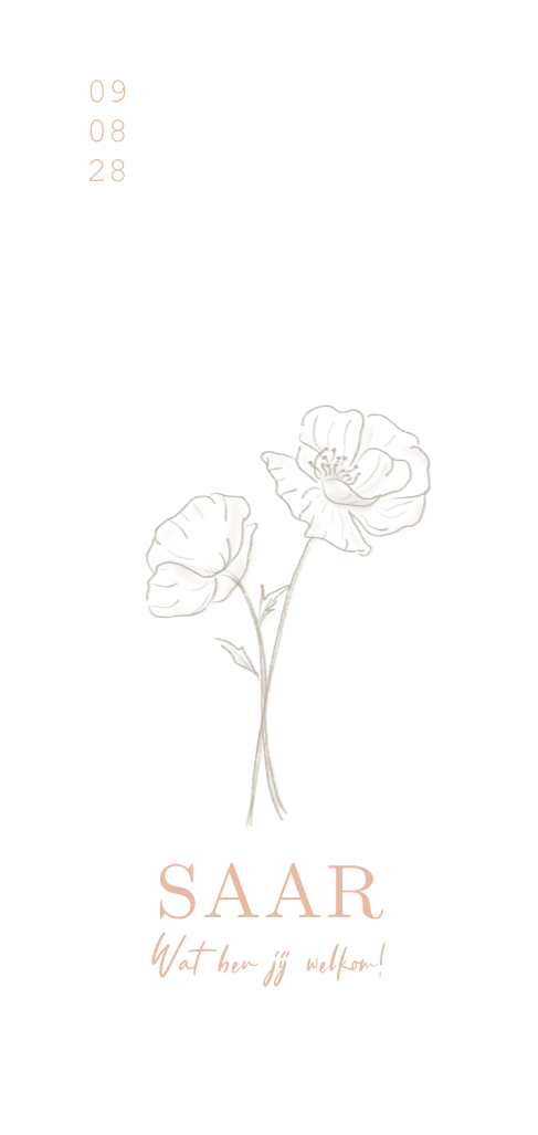 Een lief geboortekaartje met de geboortebloem van Augustus de klaproos. Beige en roze kleuren. Je kunt dit hele kaartje zelf aanpassen naar wens. Saar