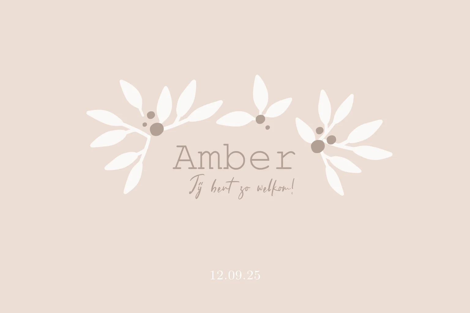 Dit lieve geboortekaartje voor een meisje met zalmroze achtergrond en witte takjes en bruin roze besjes kun je zelf helemaal aanpassen naar wens.
