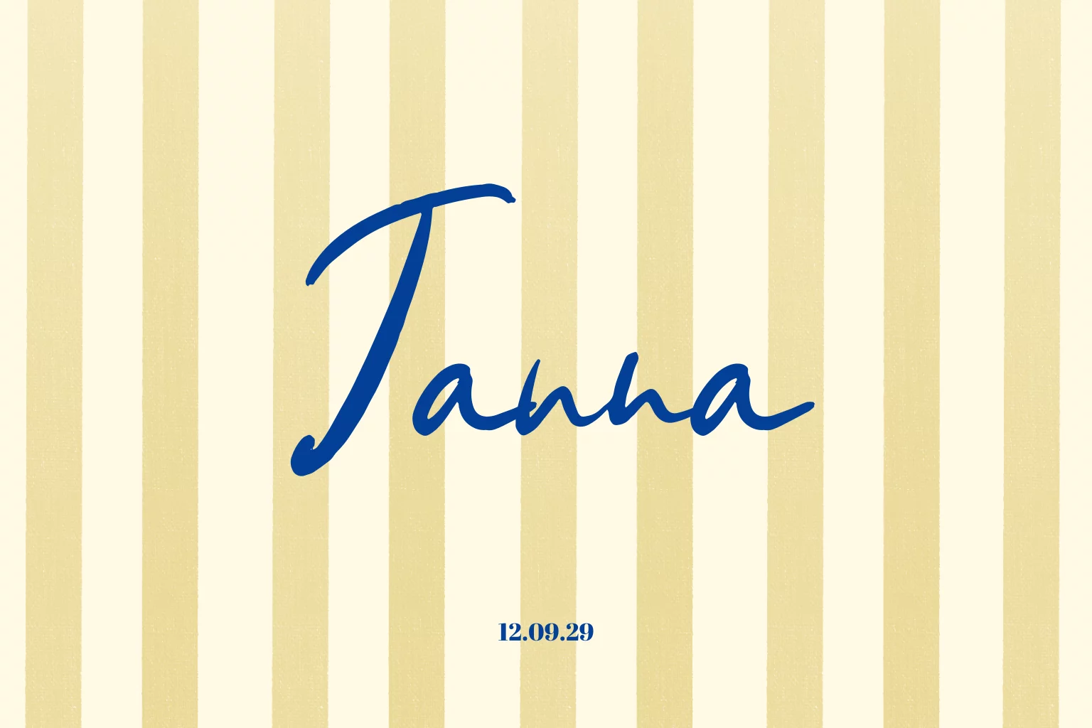 Geboortekaartje meisje met zomerse gele strepen en naam in blauw