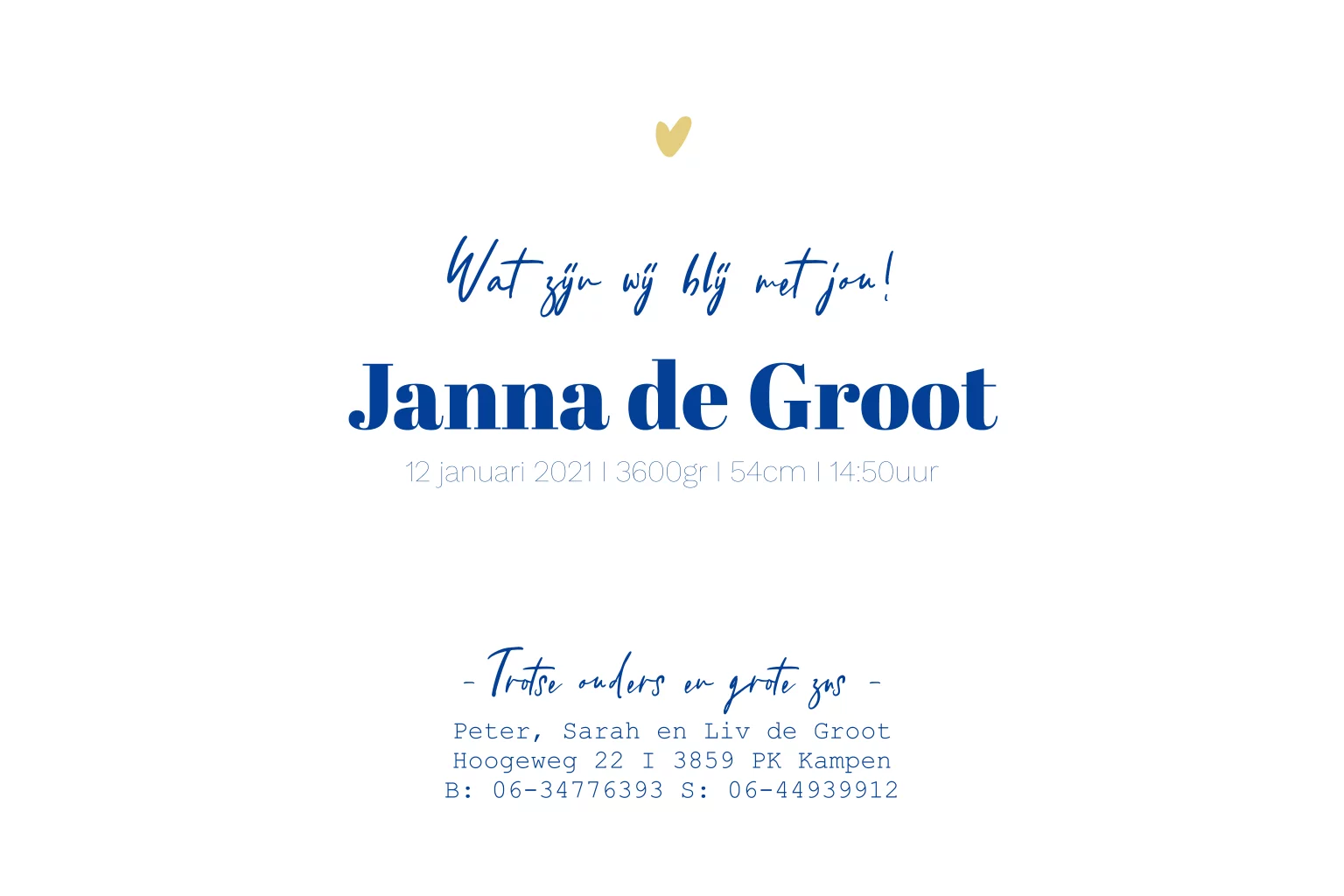 Dit vrolijke zomerse geboortekaartje met gele strepen heeft een hele toffe combi met blauw.