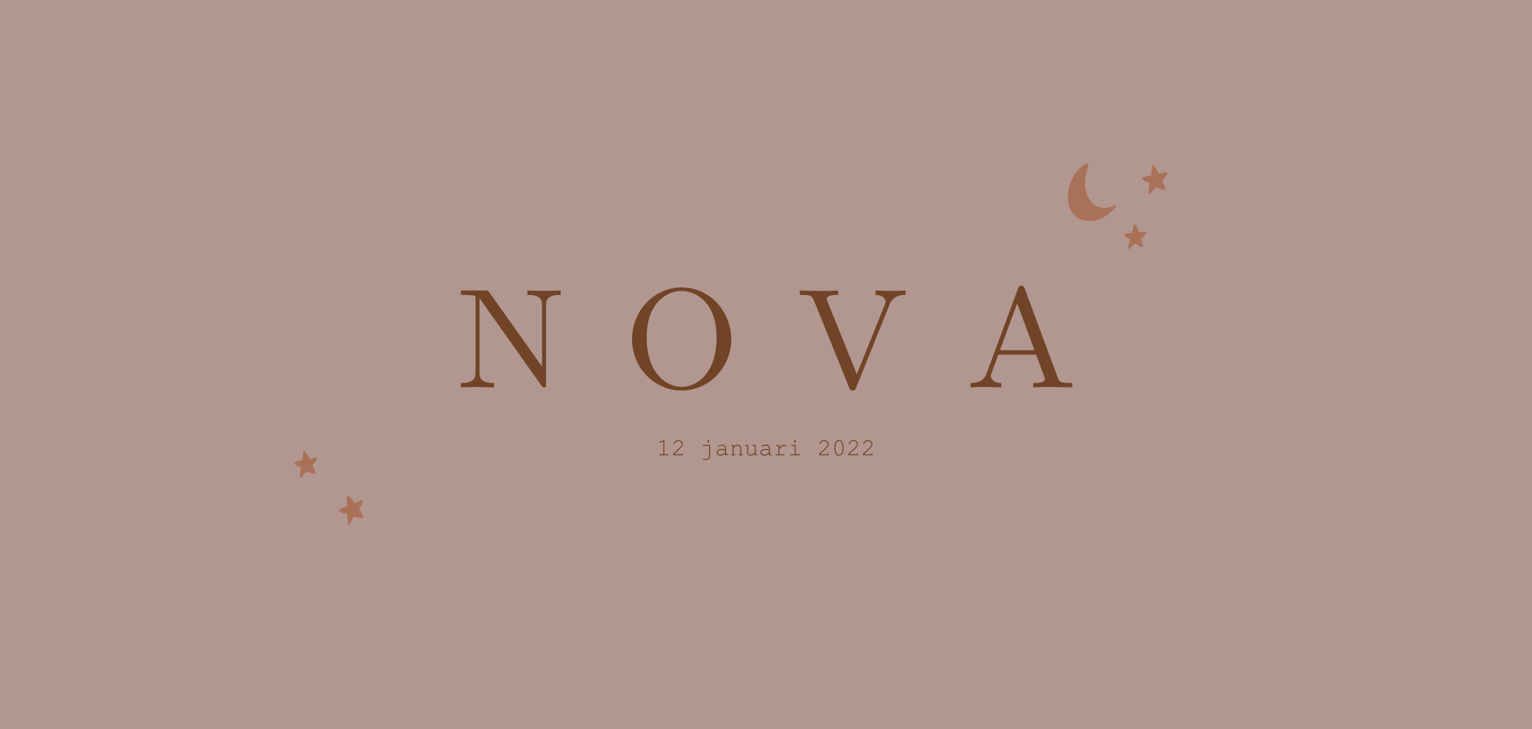 Een rustig minimalistisch geboortekaartje met maan en sterren en oud roze kleur. Liever een ander formaat dan panorama? Dat kan. Mail dan even: we helpen graag.