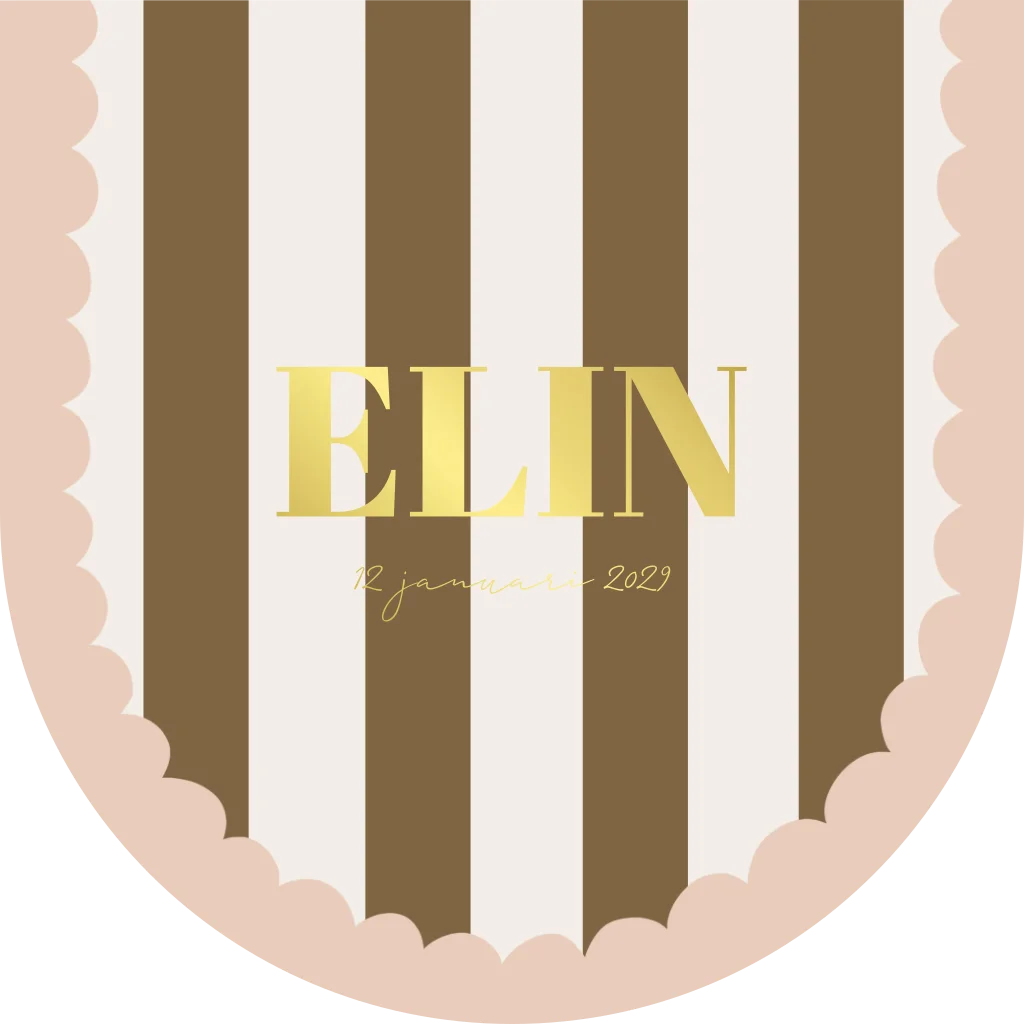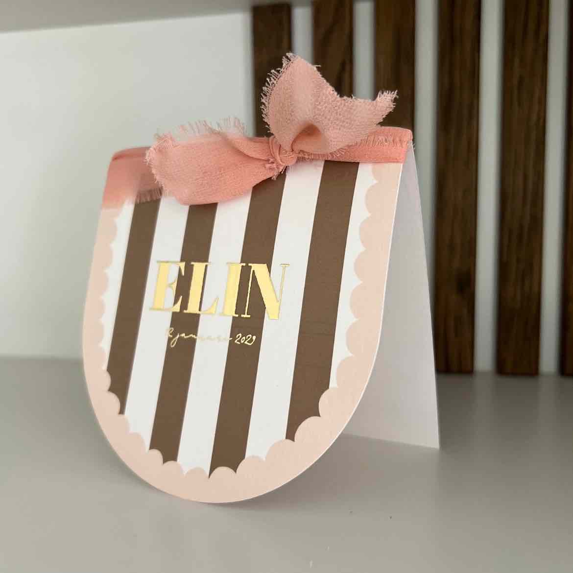 Een lief geboortekaartje voor een meisje in een originele vorm met de ronde voorkant met bruine strepen en roze golfjes rand.