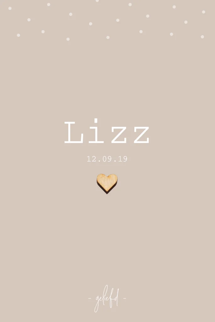 Lief geboortekaartje voor een meisje met houten hartje. Je kunt het voorbeeld hartje weghalen en een echt houten hartje bestellen om erop te plakken.