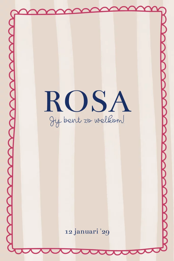 Een lief en vrolijke geboortekaartje voor een meisje met gestreepte achtergrond in wit en zalm kleur met knal roze golfjes rand kun je zelf helemaal aanpassen naar wens.