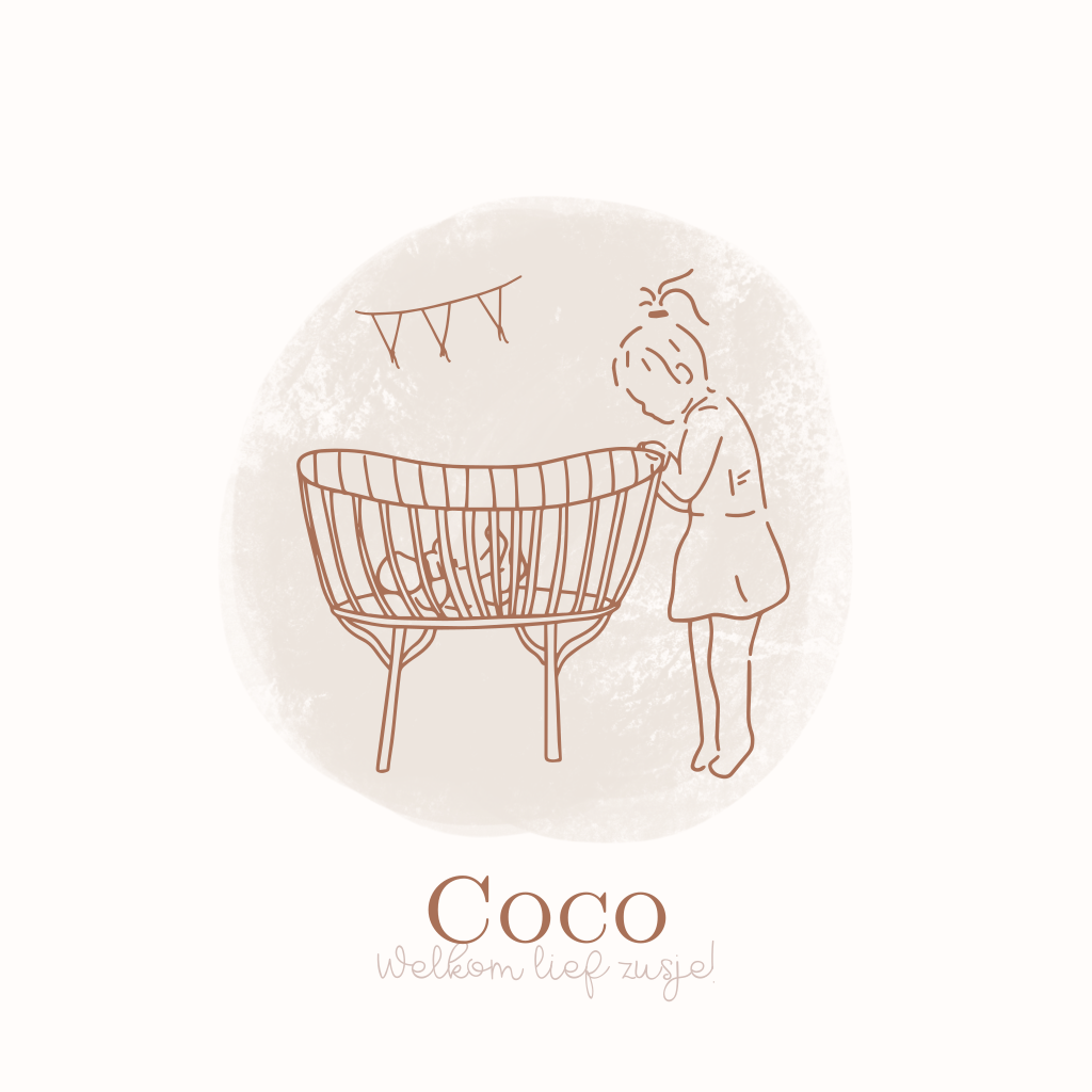 Geboortekaartje meisje zusje met lijntekening wiegje roze bruin