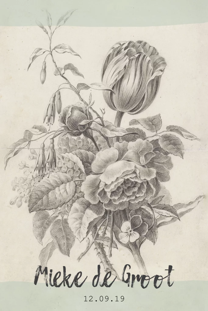 Pas het geboortekaartje aan. Speel met lettertypes en Kleuren. Illustratie: schilderij Rijksstudio Mieke