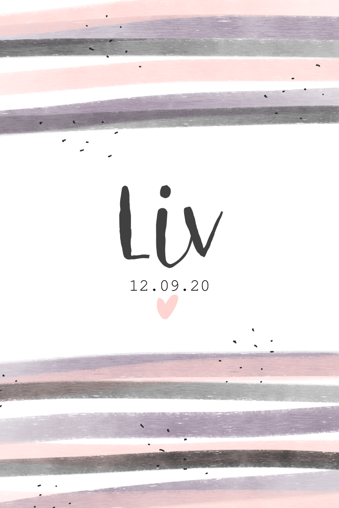 Lief maar ook stoer geboortekaartje voor een meisje met paarse, roze en grijze verf strepen. Dit stoere kaartje pas je aan naar wens.