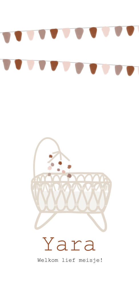 Dit lieve geboortekaartje voor een meisje met retro rotan wiegje en vlaggetjes pas je aan naar wens en smaak. Een babykamer op een kaartje. Yara