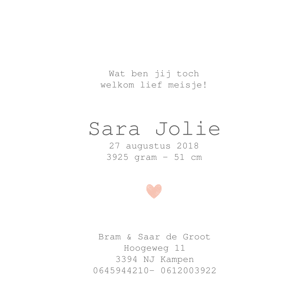 Dit lieve geboorte voor een meisje is helemaal lief met deze roze hartjes regen. De kleuren kun je zelf aanpassen naar wens, net als de tekst en de lettertypes.