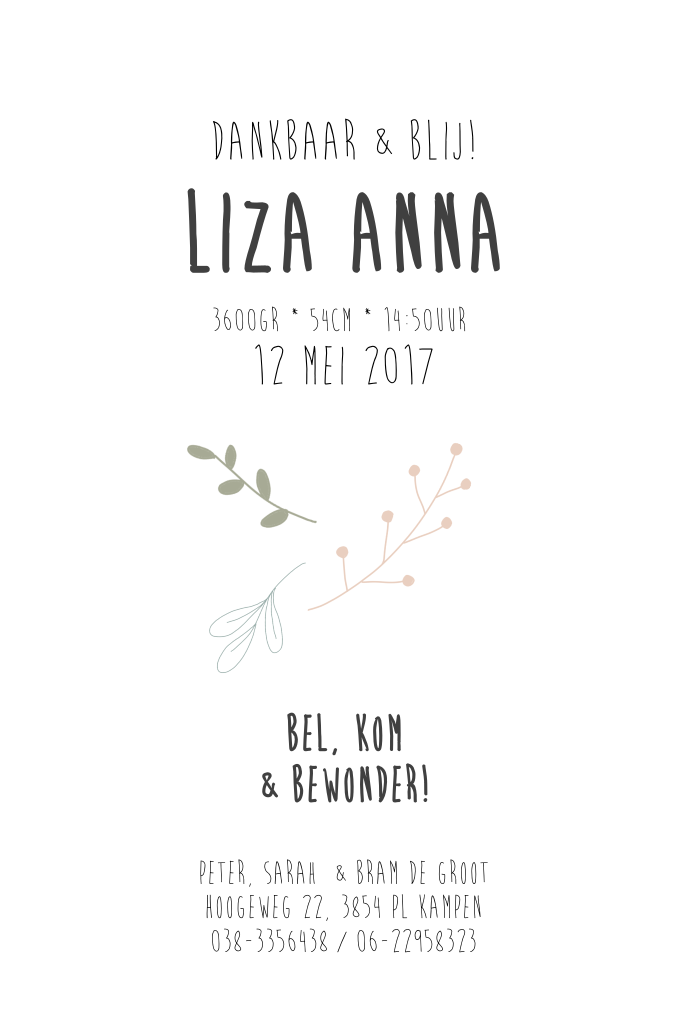 Pas dit geboortekaartje helemaal aan naar wens. Zowel het lettertype, attributen, kleuren en de achtergrond kun je aanpassen.