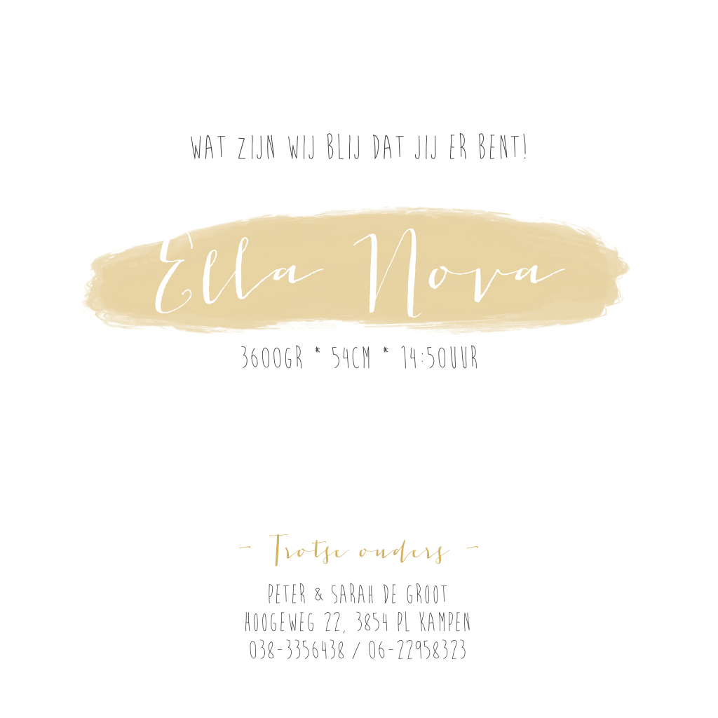 Lief geboortekaartje met okergeel rondje en verfstrepen