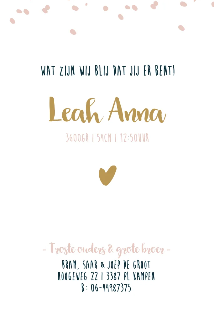 Dit geboortekaartje voor een meisje met verfstrepen pas je helemaal aan naar wens en smaak. Leah