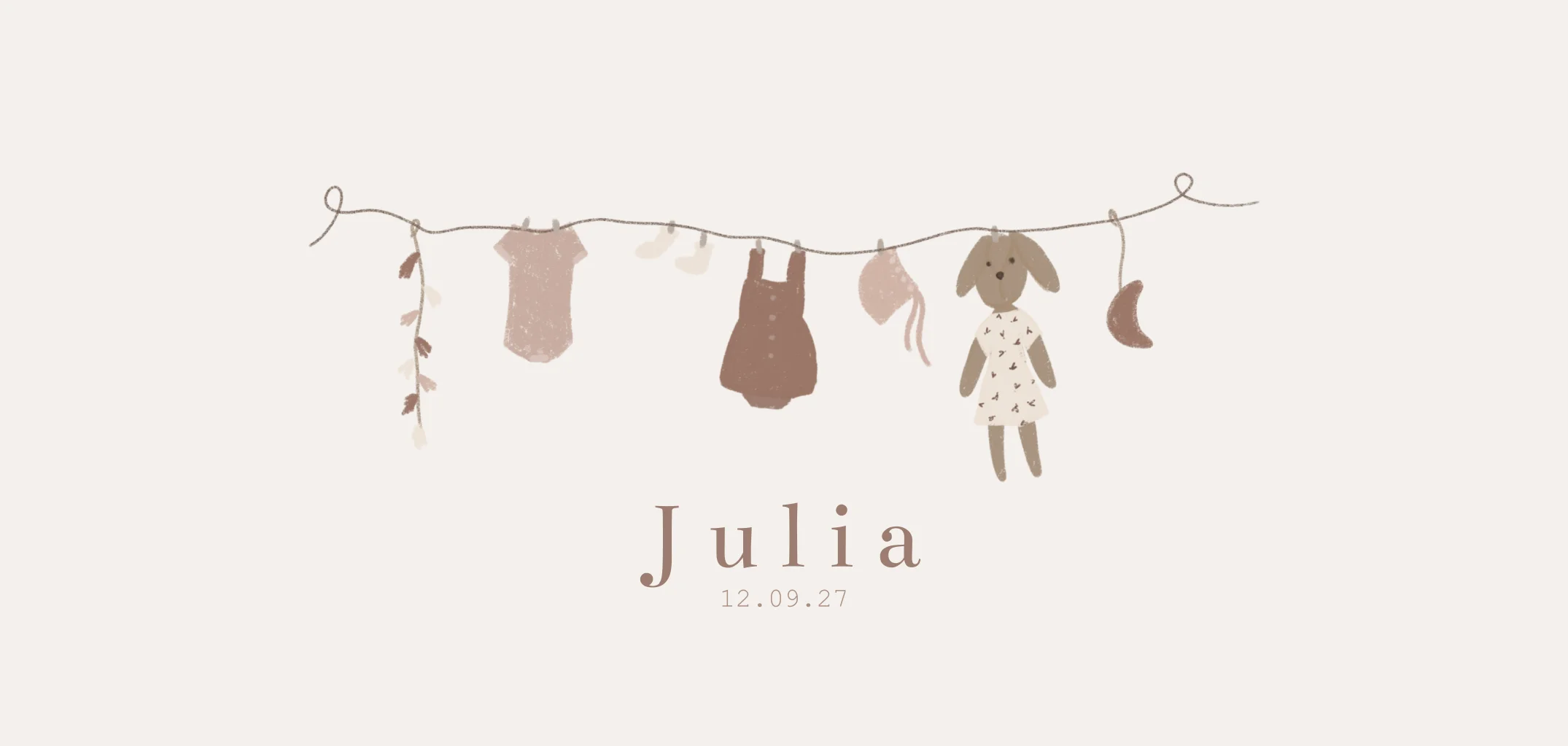Dit lieve geboortekaartje heeft een langer waslijntje door de panorama kaart vorm. De roze kleertjes en attributen geven het kaartje een lieve uitstraling.